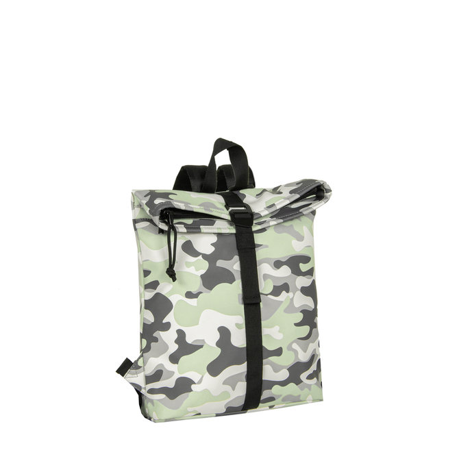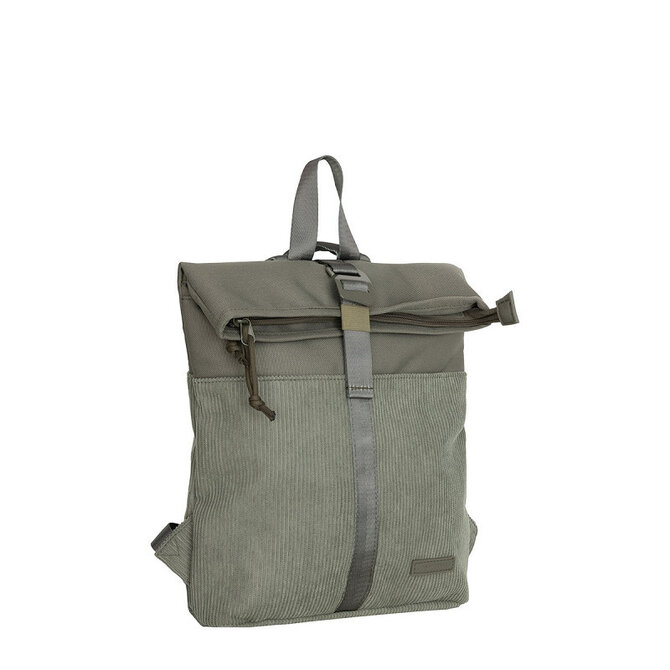 Moderner Rucksack mit Reißverschluss und Schnallenverschluss, schwarzes Innenfutter mit Fächern, Reißverschlusstaschen vorne und hinten und stabilem Tragegriff. Leicht und stilvoll. 13 Liter Fassungsvermögen, aus Ribcord-Material.