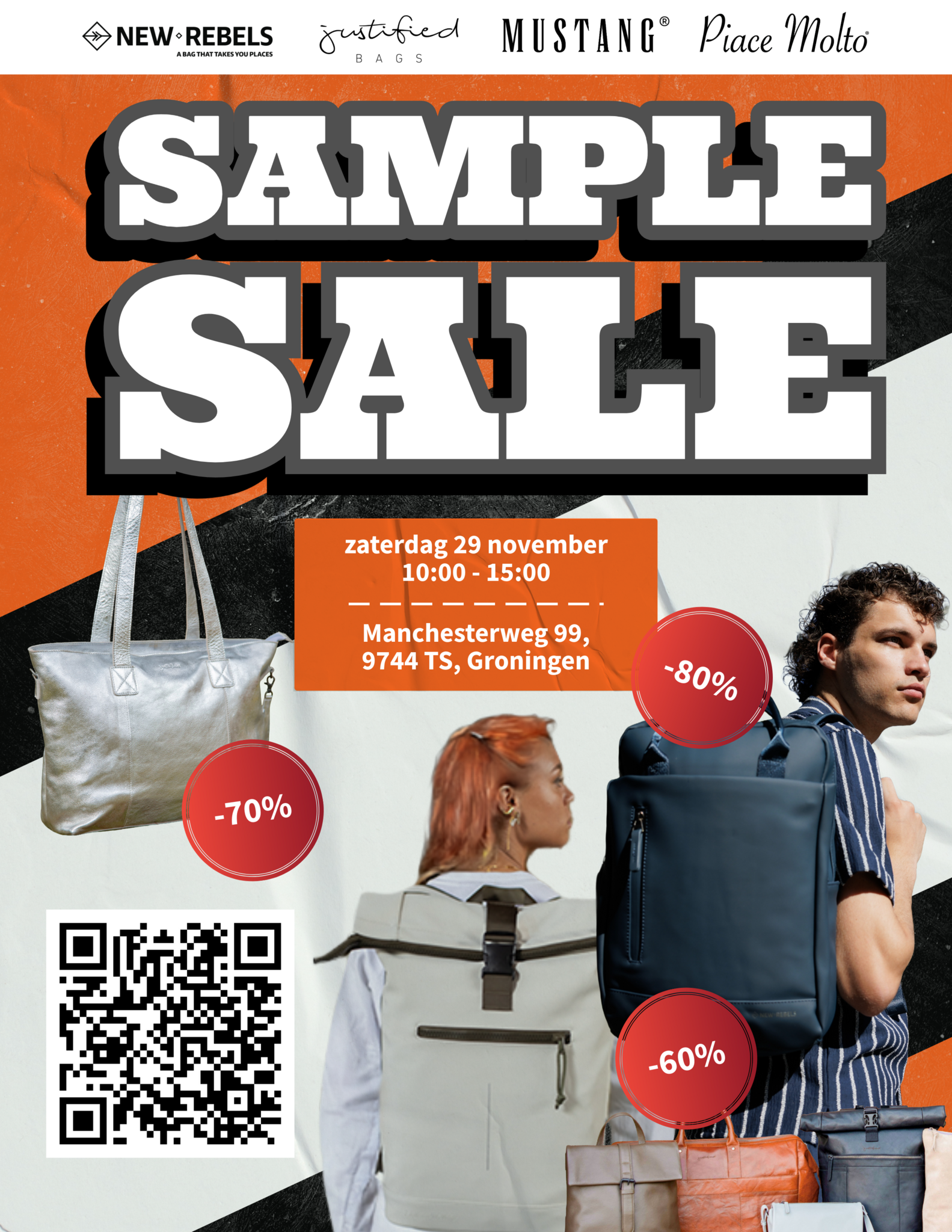 Op zaterdag 29 november openen we de deuren van ons magazijn in Groningen voor een exclusieve Sample Sale. Van 10:00 tot 15:00 kun je jouw favoriete New Rebels, Justified, Mustang, en Piace Molto tassen scoren met hoge kortingen!